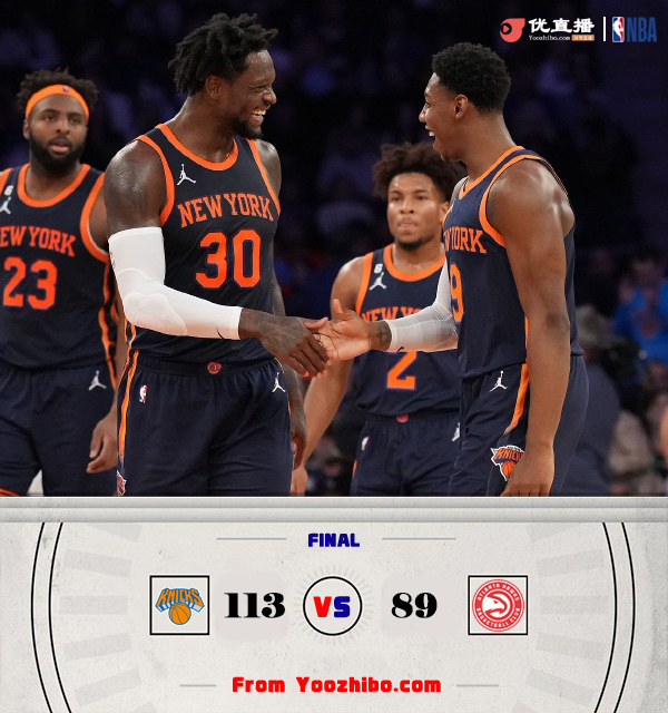 24直播网12月8日讯 NBA常规赛尼克斯对阵老鹰,尼克斯目前排名东部第九,老鹰则是排在东部第四,但上场比赛他们遭遇雷霆逆转。开场后尼克斯迅速找到进攻状态,他们内外开花建立领先,老鹰虽然内线发挥还不错,但他们三分线外频频打铁,穆雷也在开场不久就受伤离场,首节尼克斯取得11分领先。第二节尼克斯进攻状态下降,但老鹰依旧外线无法打开局面。下半场老鹰进攻依旧疲软,全队三分线外疯狂打铁,尼克斯继续拉大分差,兰德尔第三节独得19分,老鹰无力回天,最终尼克斯轻松送给老鹰2连败。