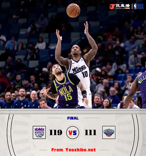 24直播网2月13日讯 NBA常规赛激战正酣,国王和鹈鹕两支西部球队直接对话,鹈鹕遭遇9连败,12胜41负西部垫底,国王迎来连胜后战绩更新为27胜26负,暂列西部第9位。首节开打后双方便陷入缠斗,埃利斯替补登场扮演奇兵,连中三分单节贡献13分,帮助国王中段发力拉开比分,首节结束时国王确立8分优势,次节回来,锡安和阿尔瓦拉多内外结合率队追分,德罗赞连投带罚稳住局势,半场战罢,国王依然领先4分。易边再战后双方比分继续紧咬,中段鹈鹕进攻断电,国王抓住机会轰出12-0攻击波,三节结束后国王保持8分优势,末节决战,鹈鹕进攻乏力追分无望,国王多点开花锁定胜局,最终国王击败鹈鹕送对手10连败。