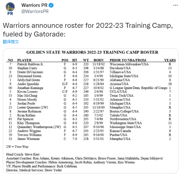 24直播网09月27日,勇士官方正式宣布和伊戈达拉续约,一哥回归再战最后一年,新赛季结束后他将会退役;勇士新赛季20人训练营大名单正式出炉,库里克莱领衔14+2卫冕阵容。