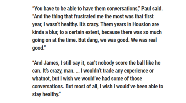 “最令我感到失望的就是第一个赛季,我没能保持健康,这很疯狂。在休斯顿的那些年,某种程度上来说,有些灰暗,因为那段时间发生太多事情。但是,我们当时很强,真的非常强。”保罗说道。