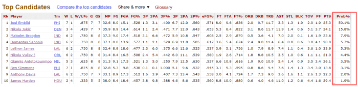 目前排在首位的是恩比德,他的MVP几率高达50.1%。恩比德所在球队7胜1负,是联盟最佳战绩,恩比德本人的数据也很出色,达到场均25.3分11.7篮板3.3助攻1.3抢断1.9盖帽,投篮命中率52.8%,三分命中率40.9%,罚球命中率83.6%。健康状态下的大帝,确实是相当无解的存在。