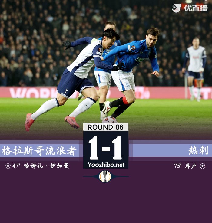 24直播网讯 北京时间12月13日欧联杯联赛阶段第6轮,热刺客场对阵格拉斯哥流浪者。上半场,维尔纳、孙兴慜造险。易边再战,哈姆扎-伊加曼打破僵局,库卢替补建功扳平,德瑟尔斯越位进球被吹。最终流浪者1-1热刺。积分榜方面,热刺11分暂第九,流浪者同分第八。
